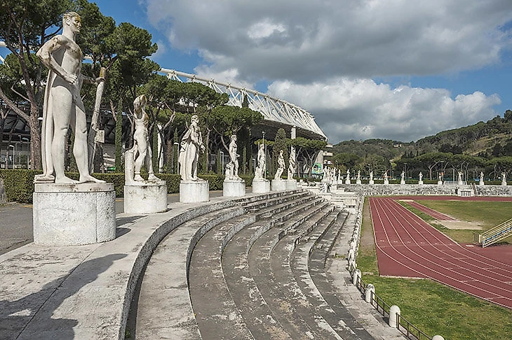 Вокруг Мраморного стадиона установлены 60 псевдоантичных скульптур спортсменов, в 1930-х подаренных Форуму итальянскими провинциями: теннисисты из Пармы и Рагузы, боксер из Кьети, прыгун в воду из Полы, гимнаст из Милана, лыжник из Больцано. Еще несколько статуй стоят на корте имени Николы Пьетранжели – некогда центральной арене теннисного комплекса «Форо Италико». Названа она в честь лучшего теннисиста в истории страны – двукратного чемпиона «Ролан Гаррос» до Открытой эры (по легенде, под конец карьеры в Риме на закрытой жеребьевке выбирал себе соперников). В южной части комплекса находится сейчас заброшенное здание академии фехтования, спроектированное легендой итальянской архитектуры Луиджи Моретти, – общепризнанная жемчужина модернизма.