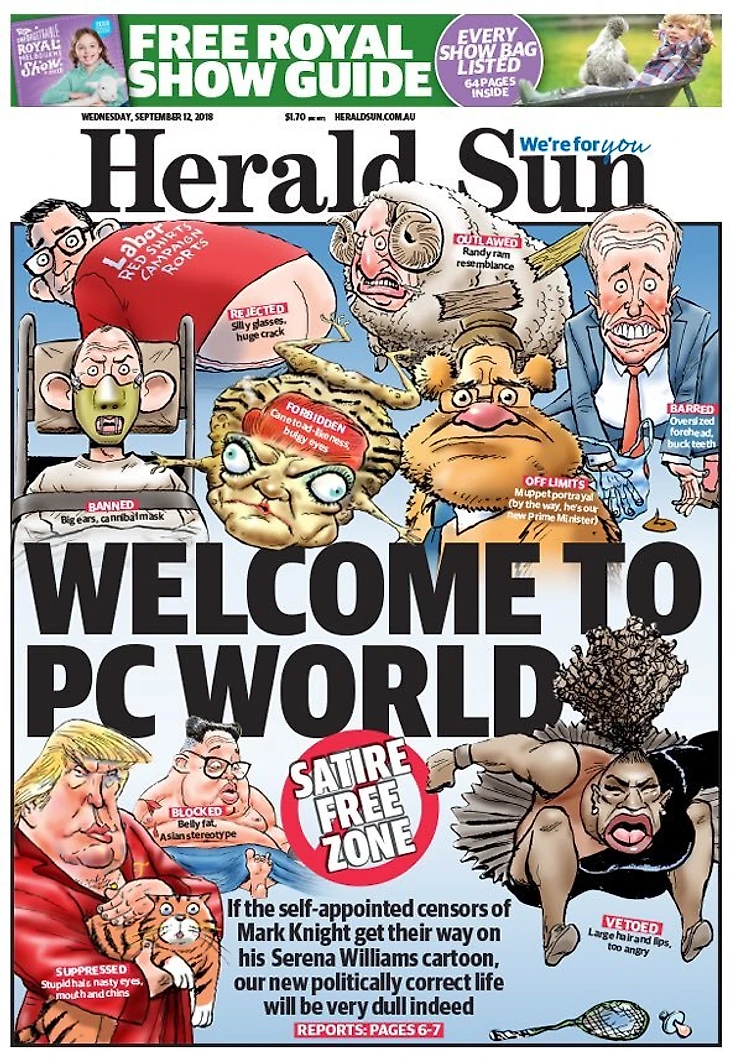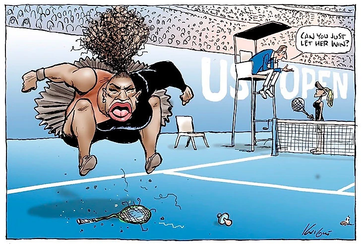 В понедельник самая популярная газета Австралии Herald Sun вышла в карикатурой на Серену Уильямс в скандальном финале US Open. На рисунке Уильямс изображена как большой капризный ребенок, бьющийся в истерике, пока рядом валяются соска и разбитая ракетка, а поодаль судья обращается к ее светловолосой сопернице со словами «Может, просто дашь ей победить?».