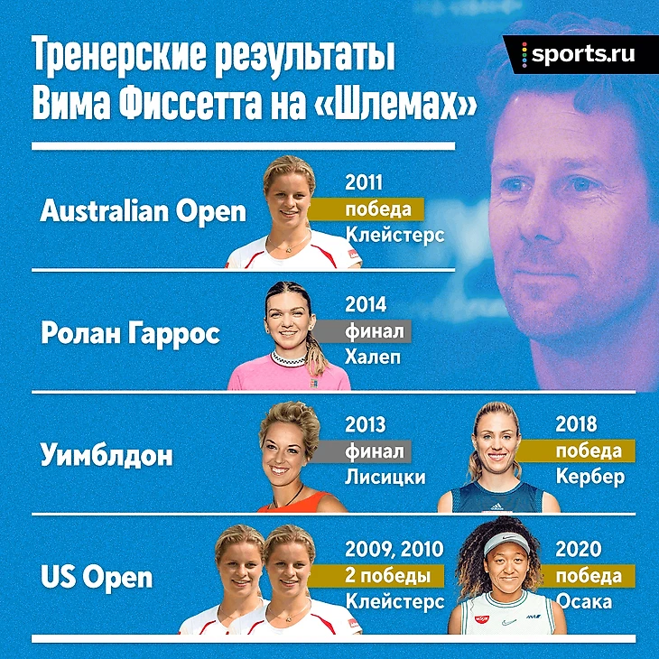 В декабре 2019-го о начале сотрудничества с Фиссеттом объявила Наоми Осака. Японка в тот год успела поработать с тремя тренерами. Australian Open она выиграла с Сашей Баиным, но уже через две недели рассталась с ним и начала работать с Джермейном Дженкинсом. В сентябре они тоже прекратили сотрудничество, и до конца сезона Наоми тренировал отец.