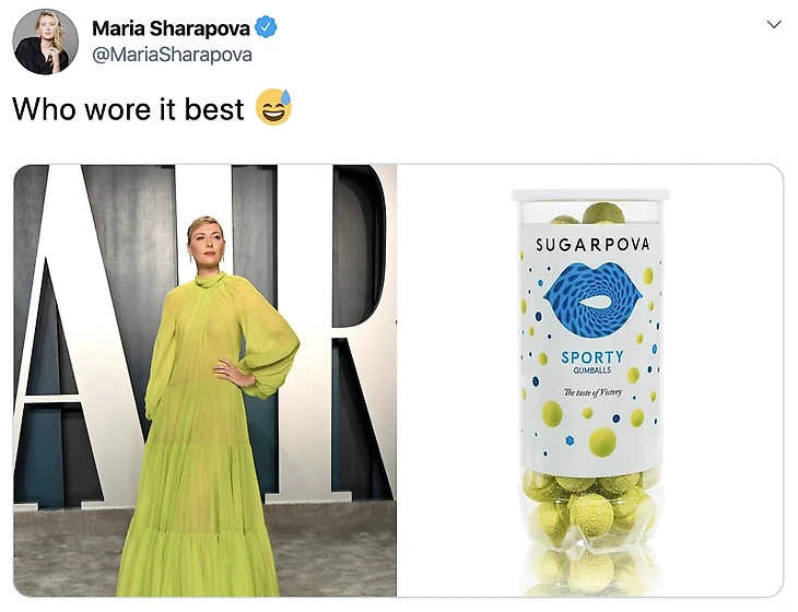 Шарапова, в прошлом году надевавшая на вечеринку VF платье вдвое дешевле, описала свои впечатления словами «Провела вечер в море элегантности», а потом поддержала аналогию с теннисным мячом (и заодно прорекламировала свои конфеты):