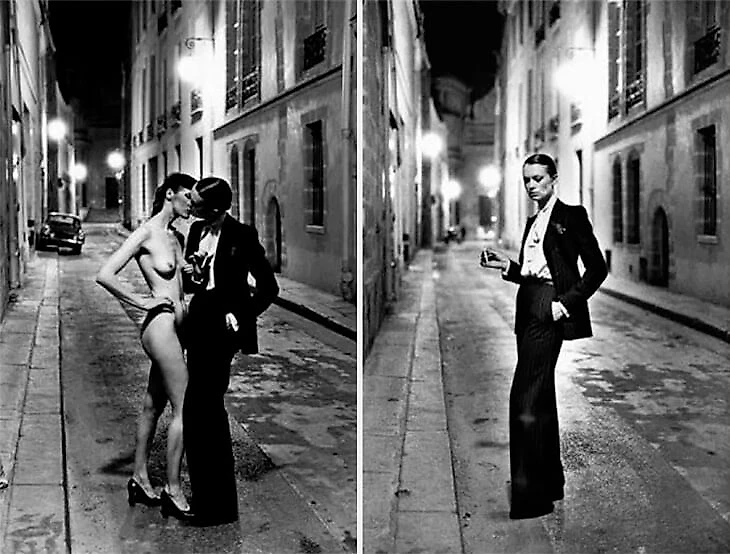 В 1975-м смокинг YSL окончательно превратился в культ благодаря двум снимкам, которые маэстро Хельмут Ньютон сделал для французского Vogue: на одном модель в образе бодлеровского денди стоит в ночном переулке в районе Марэ, а на втором рядом с ней девушка, на которой нет ничего, кроме шляпки с вуалью.
