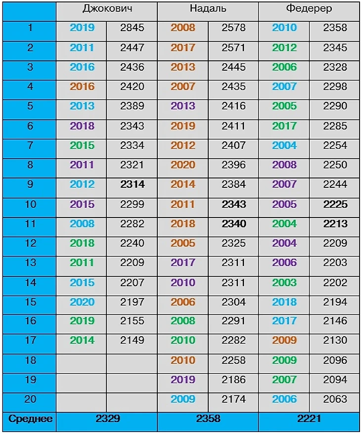 Для того, чтобы получить ответ на первый из трёх главных вопросов исследования, необходимо рассмотреть рейтинги полуфиналистов ТБШ, а также рейтинги по итогам года игроков 2003-07 годов и 2011-16 годов, и затем провести сравнительный анализ. Данная работа проделана в исходной статье, поэтому мы повторяться не будем – методика не изменилась, выводы те же самые, включая признание теннисного периода 2011-16 годов «Золотой эпохой тенниса». Необходимо лишь учесть, что за прошедшие два года на сайте ultimatetennisstatistics.com, с которого берутся значения рейтинга Эло, произошли изменения, связанные с тем, что каждому теннисисту увеличили рейтинг на 20…25 пунктов. Это преобразование никак не влияет на суть исследования, поскольку в рейтинге Эло важны не абсолютные значения, а только разность между игроками, которая сохранена, но его необходимо учесть.