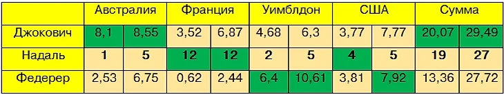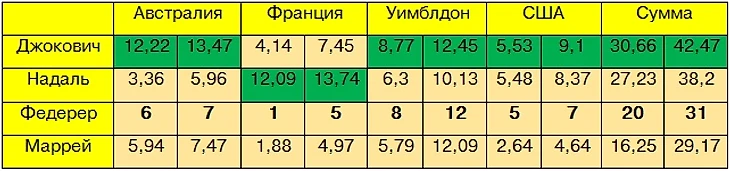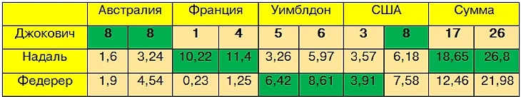 Теперь приведём результаты расчётов ожидаемого количества титулов и финалов ТБШ Джоковича, Надаля и Федерера по сеткам друг друга. Для наглядности по сеткам швейцарца также приведены результаты Энди Маррея, у которого 3 кубка и 8 тарелок на «мэйджорах».
