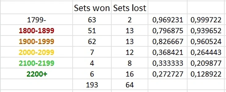 2. Распределим все полные матчи A на этих турнирах по уровню сложности соперников, в зависимости от их рейтинга Эло: очень простые (1799 и меньше), простое (1800 – 1899), средне-слабые (1900 – 1999), средне-сильные (2000 – 2099), сильные (2100 – 2199), очень сильные (2200 и выше). После этого определим количество выигранных и проигранных партий против каждого из этих шести диапазонов. В нашем примере с Федерером выигранные и проигранные сеты указаны в таблице на рис. 1.