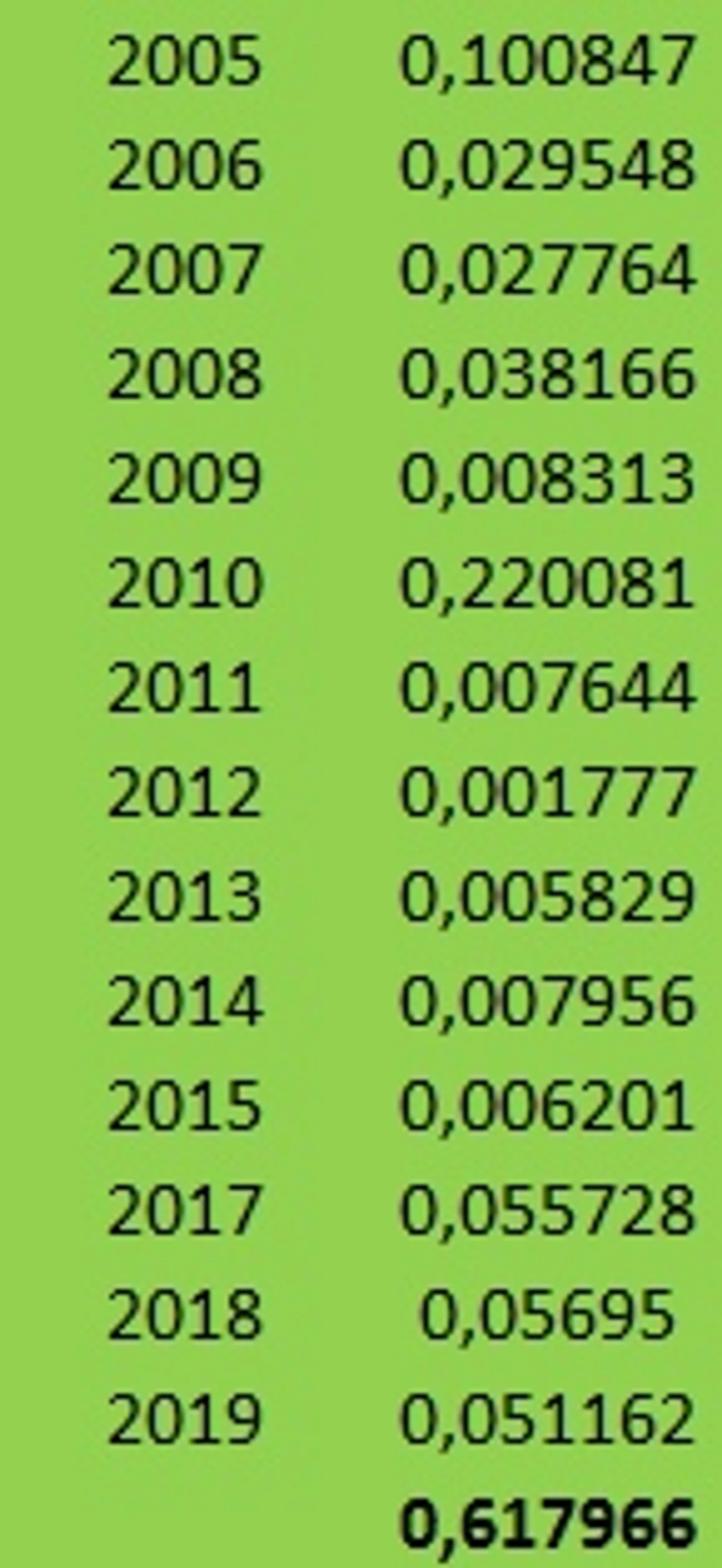 4. Рассматриваем все турниры на данном ТБШ для теннисиста B, в которых он был топ-игроком и не был травмирован (в нашем примере это Открытый чемпионат Франции 2005-15, '17-'19 годов для Надаля). Далее, для каждого из турниров определяем вероятность игрока A выиграть титул как произведение всех семи вероятностей выиграть каждый отдельный матч (при этом если соперник снялся, то вероятность победы над ним равна 1). Вероятность победы в матче зависит только от рейтинга оппонента и найдена в п. 3.
