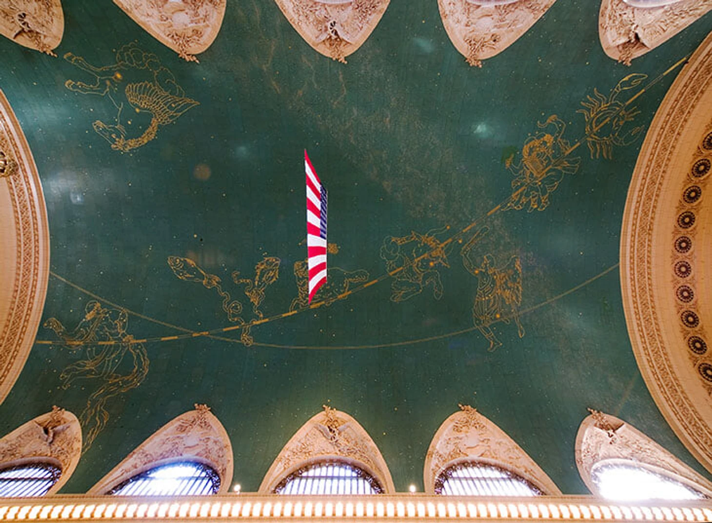 • карта созвездий, нанесенная на потолок главного зала высотой 38 метров, перевернута – по легенде, потому, что профессор Колумбийского университета Гарольд Джейкоби, у которого при строительстве попросили схему звездного неба, думал, что художники при работе будут держать ее в руках над головой, а они положили ее под ноги. Когда вскоре после открытия вокзала ошибку заметили, его многолетние владельцы миллионеры Вандербильты защищались, что так и было задумано, – «показать небо каким его видит бог»;