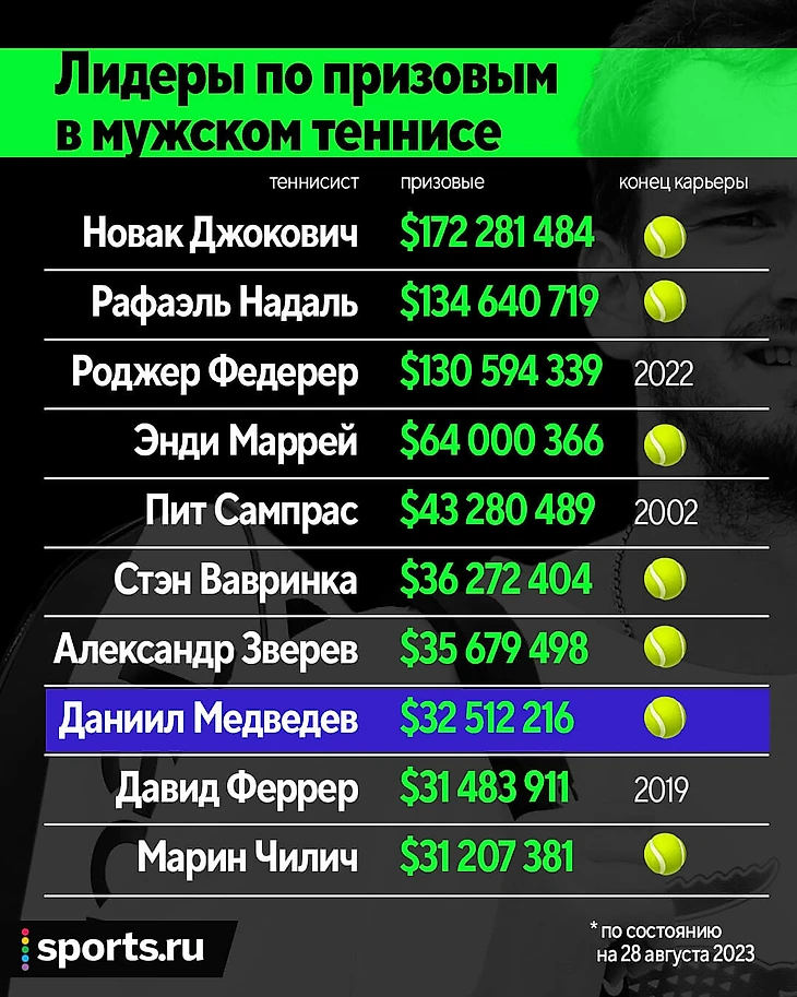 Точные данные о заработках Медведева касаются только призовых. И по ним он уже восьмой в истории ATP.