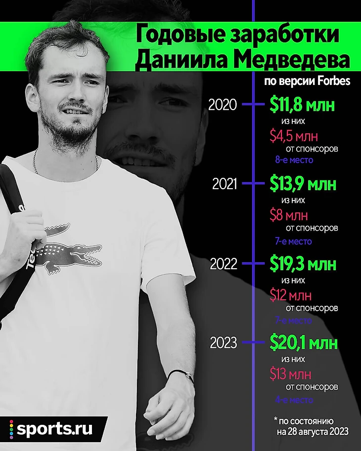 А в целом в список самых высокооплачиваемых теннисистов Медведев впервые попал в 2020-м, и с тех пор он его не покидал. Тогда он стал восьмым с суммой около 12 млн долларов. Сейчас же доходы выросли на 70%.