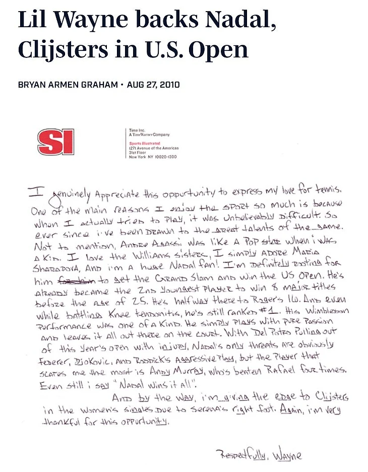 41-летний Лил Уэйн вообще большой теннисный энтузиаст. В прошлом году он был на US Open (в экипировке Wilson), а еще в 2010-м перед стартом Открытого чемпионата США предсказал его победителей: