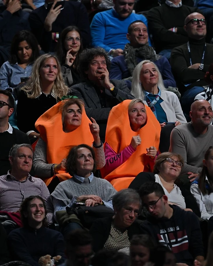 Внимание к главной группе поддержки Синнера по традиции повышенное: болельщики фотографируются с ними, медиа берут интервью, в воскресенье на главной городской площади они провели встречу с Флавией Пеннеттой. Морковные облачения они сменили на оранжевые худи с брендингом EA7 Emporio Armani или на более формальные брючные костюмы.