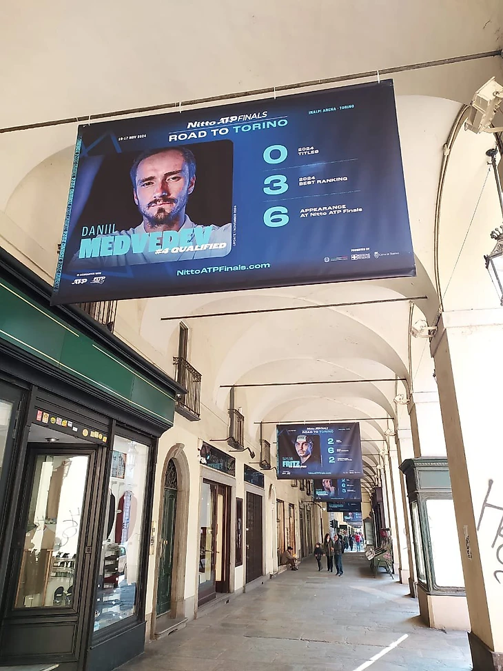 Баннеры в центре выдержаны плюс-минус в единой стилистике, меняются только лица, да и то не полностью. Например, Даниил Медведев и Андрей Рублев – единственные участники, кто не пропустил еще ни одного итогового в Турине.