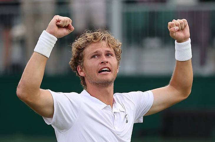192-я ракетка мира Август Холмгрен, к 27 никогда не игравший в основе «Шлема», на этом «Уимблдоне» из квалификации дошел до третьего круга, в двух матчах отыграв матчболы: три в финале квала и три в четверг против 21-го сеяного Томаша Махача (который, когда ему не разрешили переодеться между сетами, спросил судью: «А если я обосрусь?»). До прошлой недели датчанин никогда не играл в пятисетовом формате, а с тех пор провел три таких матча подряд, из которых один длился почти четыре часа, а другой – почти пять. Он за один турнир удвоил свои карьерные призовые и теперь встретится с Алексом де Минауром (11).