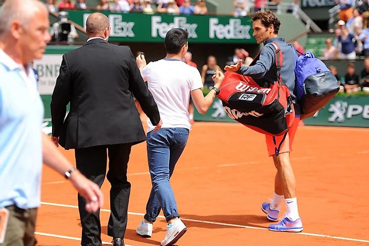 В воскресенье на «Ролан Гаррос» Роджер Федерер не испытал проблем в матче первого круга против 109-й ракетки мира Алехандро Фальи, после чего оказался в гораздо менее выигрышном положении: молодой болельщик выбежал на корт и успел приобнять, сделать селфи и пройтись рядом с великим швейцарцем, прежде чем к нему подошел-таки представитель службы безопасности.