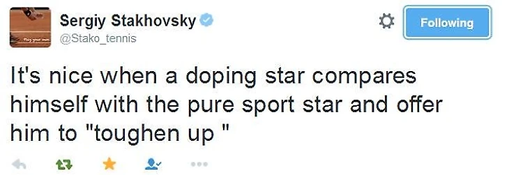 Не остался в стороне и украинский №1 вездесущий Сергей Стаховский, саркастично заметивший, что «допинг-звезда» учит жизни икону спорта. Позднее твит был удален.