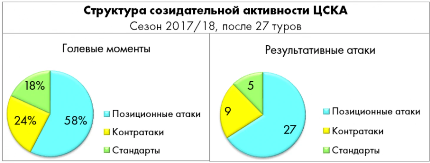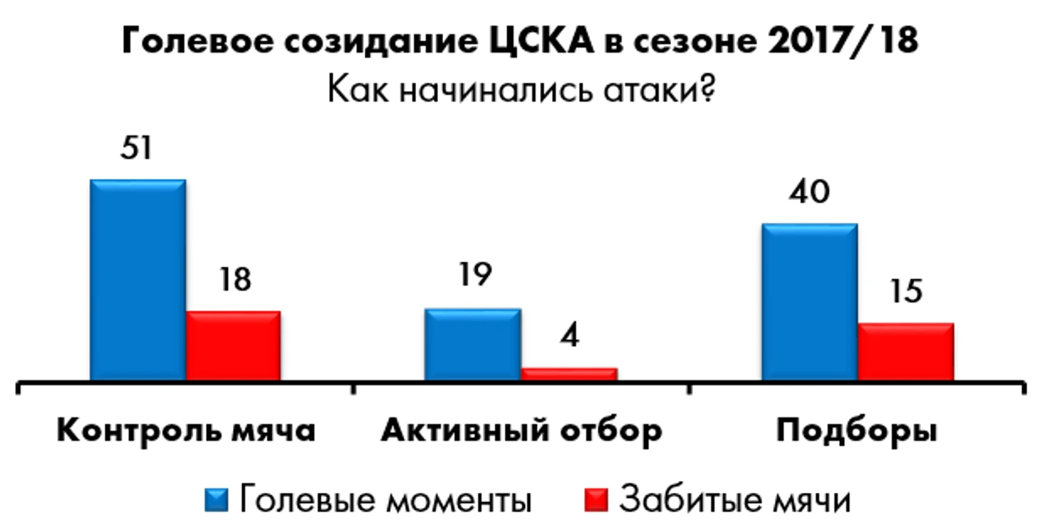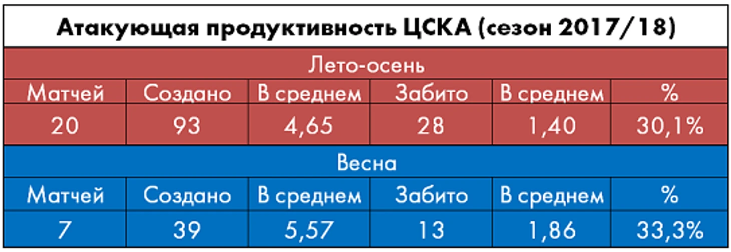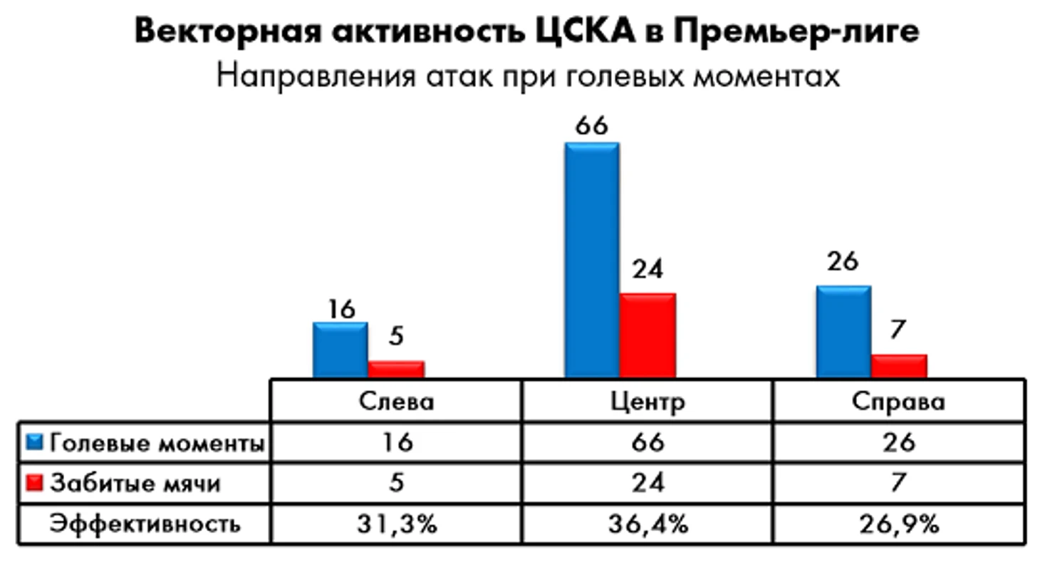 Весной армейцы создают на 20% голевых ситуаций больше, чем осенью, причем именно за счет повышения качества быстрого нападения (прибавка в этом компоненте более чем двукратная — с 0,9 до 2,0 острых контратак за игру). Гостевой матч против «Ахмата» в этом плане оказался для команды Гончаренко самым удачным (6 моментов в контратаках / 2 гола), а в качестве основных разгоняющих в Грозном выступили Головин, Муса и Витиньо (по 4 момента с участием каждого).Как это всегда и бывает, шансы на скоростной выход в атаку возникают благодаря слаженному командному прессингу. Это всецело подтверждается отличной статистикой ЦСКА по заблокированным передачам (7,8 за игру — лучший показатель в лиге) и подборам, с которых стартовали остроатакующие цепочки.Интересно, что лидерами ЦСКА по ключевым единоборствам являются Вернблум (11 при 5 результативных) и Натхо (8/3), причем швед большую часть отборов/перехватов/подборов (8 из 11) сделал во втором круге — аккурат после того, как из опорной зоны почти на постоянной основе был переведен в нападение. Как ни странно, у Головина статистика по ключевым единоборствам заметно скромнее (4/1), хотя Александр — один из самых активных в прессинге. И тут нет никаких противоречий, потому его основная задача — вывести соперника из зоны комфорта и спровоцировать на ошибку, тем самым создав своей команде условия для возврата владения.Армейцы чаще всех в лиге создавали моменты в результате удачных попыток высокого прессинга, причем качественной прибавки, опять-таки, добились именно во втором круге чемпионата (начиная с 16 тура – 19/31 голевых моментов и 10/11 забитых мячей). Еще одним важным наступательным инструментом для армейцев являются дальние удары. В среднем игроки ЦСКА как минимум один раз за матч реально угрожают воротам соперника издали (в 27 турах – 31 момент/ 8 голов/ 2 штанги), а основная опасность исходит от Витиньо (11/4) и того же Головина (8/2).Централизация атак — еще один очевидный тренд, который сложился уже при Гончаренко. По сравнению с прошлым сезоном доля голевых моментов после атак через центр выросла с 46% до 61%, причем и в плане эффективности это направление выгодно отличается от фланговых. Как следствие, мяч в штрафную преимущественно доставляется низом (попытки разрезающих передач поставлены на поток), и даже с Вернблумом в роли наконечника «передаточная логистика» остается примерно той же. В весенних турах из 33 потенциально голевых комбинаций «с игры» только в двух случаях красно-синие использовали кроссы в завершающей фазе (в матче с «Уралом» такая подача Дзагоева, не задев никого, стала результативной), и в этом смысле ЦСКА является полным антиподом «Зениту».Тем не менее, с возвращением в строй Марио Фернандеса можно ожидать, что при позиционных атаках ЦСКА может создавать перегруз на его правом фланге с угрозой перевода в разреженное пространство на левом. Эта атакующая идея для армейцев не нова, но ее эффективность неоднократно доказана.Стандарты — пожалуй, единственный атакующий аспект, в котором красно-синие при Гончаренко не прибавили. Если по итогам прошлого сезона «стандартная составляющая» в общекомандном креативе составляла почти 24% (11 мячей из 47), то в текущем – только 11% (5 из 42). Прямыми ударами со штрафных в рамках чемпионата армейцы пока не забивали, но и Витиньо, и Натхо, и Головин на это точно сп
