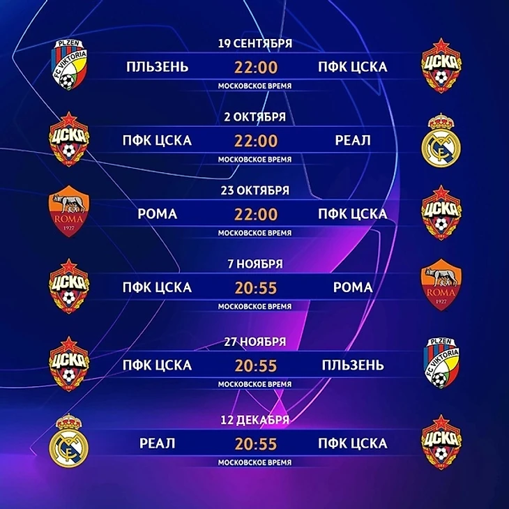 1-й тур19 сентября«Виктория» (Пльзень) — ПФК ЦСКА«Реал» — «Рома»