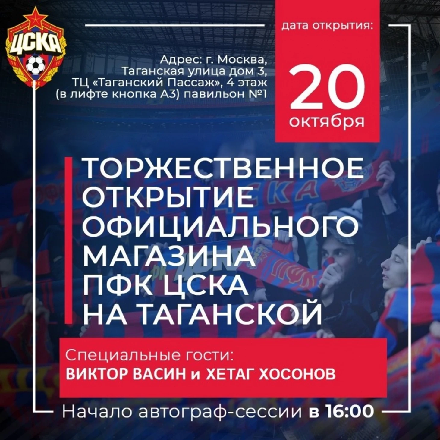 Приглашаем вас 20 октября на торжественное открытие нового фирменного магазина ЦСКА, в ТЦ «Таганский Пассаж» (Таганская улица, 3)