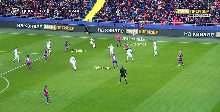 В чужой трети ЦСКА использовал забросы, диагонали Магнуссона и смещения вглубь одного из участников атакующей четвёрки. Стандартная ситуация для «армейцев» – 3v3 против центральных защитников «Рубина» + 1 игрок на подборе. Влашич и Нисимура получили фиксированные задачи в таких атаках – Влашич обычно заполнял зону подбора, а японец открывался за спину одному из защитников, которого либо вытягивали выше, либо приклеивал к себе другой игрок атаки.