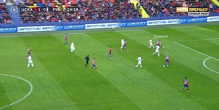 Доминирование ЦСКА на длительных отрезках матча напрямую связано с качеством контрпрессинга. «Армейцы» 17 раз вернули владение на чужой трети поля, особенно мощно накрывая правый фланг – тот, где играл Дивеев. После потерь направо смещался весь треугольник полузащитников, в том числе страхующий опорник Ахметов, там же помогал Марио Фернандес. Втроём они забирали мяч, а после отбора или перехвата тащили в центр стараниями Влашича.