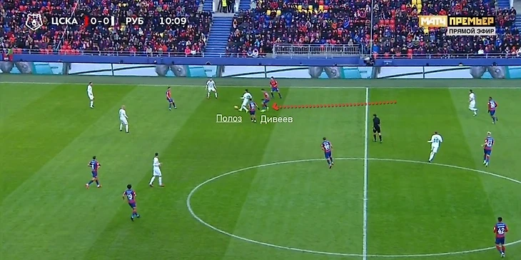 При владении «Рубина» Дивеев высоко накрывал на приёме Полоза (или Бухарова, когда он приходил в его полуфланг под длинные передачи). Система контрпрессинга ЦСКА, о которой будет чуть ниже, срывала выход «Рубина» через зону Дивеева, и из-за этого защитник провёл всего 7 единоборств за матч – меньше, чем любой другой игрок «армейцев» – и выиграл 5. Когда мяч всё-таки доходил в полуфланг до Полоза, Игорь если не шёл в активный отбор, то как минимум резко выжимал из своей зоны на приёме. Если надо было подстраховать контрпрессинг в центре, Дивеев правильно сужал пространство вместе с Магнуссоном.