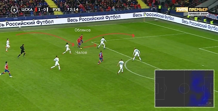 Задачи Облякова и Чалова были более широкими. Чалов выдал очень сильный матч в подыгрыше, сделал 6 острых передач, и ключевая причина – в паре с Нисимурой у него более широкий круг обязанностей. За исключением правого полуфланга (зона активности Влашича), Чалов получал мяч по всему периметру финальной трети, навешивал с позиции Облякова, разыгрывал мяч на углах штрафной. Во втором тайме, когда «Рубин» чуть раскрылся и стал допускать больше быстрых атак, Чалов ещё и показывал сильный тайминг, своевременно пасуя в контратаках на ход Облякову. Плюс к этому Фёдор ещё и бодро работал в прессинге. Футбол Чалова становится всё более разнообразным.