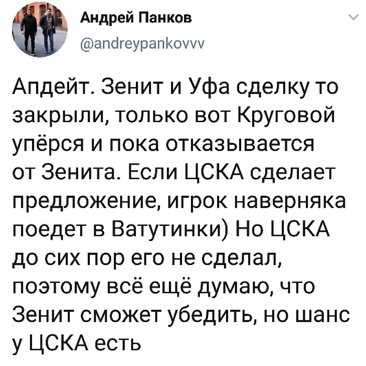 Как сообщает журналист Андрей Панков: «Зенит и Уфа сделку то закрыли, только вот Круговой упёрся и пока отказывается от "Зенита".