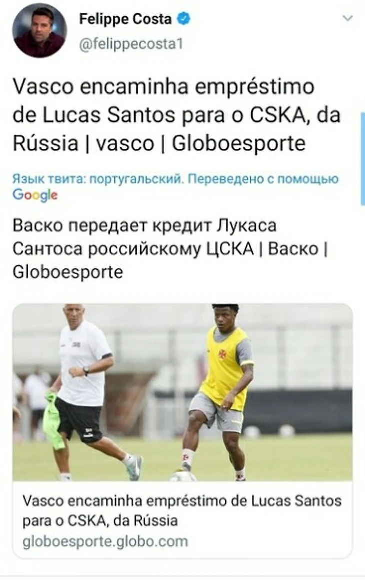 Как сообщает бразильская пресса, после долгих переговоров, "Васко да Гамо" отправит в аренду полузащитника Лукаса Сантоса в ЦСКА до декабря этого года.