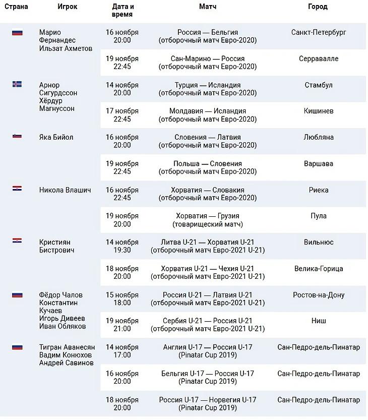 В сборную России на матчи отборочного цикла к Евро-2020 против Бельгии и Сан-Марино отправились Марио Фернандес и Ильзат Ахметов. Помимо этого к национальной команде присоединился тренер по физподготовке Паулино Гранеро.