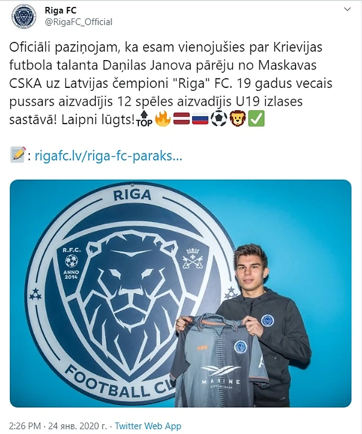 Официально сообщаем, что мы договорились о переходе российского футбольного таланта Даниила Янова из московского ЦСКА в чемпионы Латвии ФК «Рига». 19-летний футболист провел 12 игр провел в составе сборной U19!