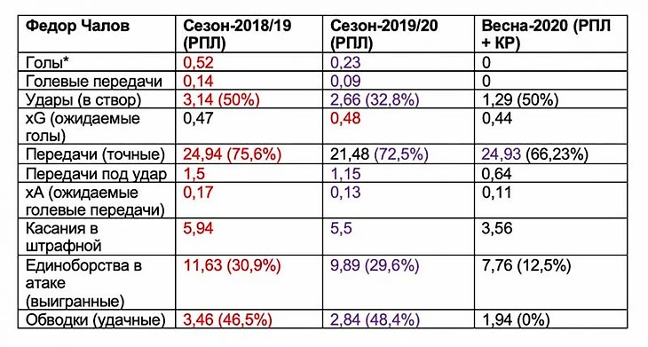 Для понимания текущей формы и игры Чалова для начала будет полезно изучить таблицу снизу. В ней приведены данные за три периода: весь сезон-2018/2019 (лучший для Чалова в карьере), нынешний сезон, а также все новые весенние матчи, включая кубковое дерби с ЦСКА.В первую очередь в глаза бросается проседание по ВСЕМ основным атакующим характеристикам в новом чемпионате и громадное их падение – в весеннем отрезке. Чалов стал намного меньше бить, касаться мяча в штрафной, допускает чрезмерный для самого себя брак в передачах, сохраняет маловато мячей, реже ассистирует, слабее выглядит в борьбе, плохо обводит.
