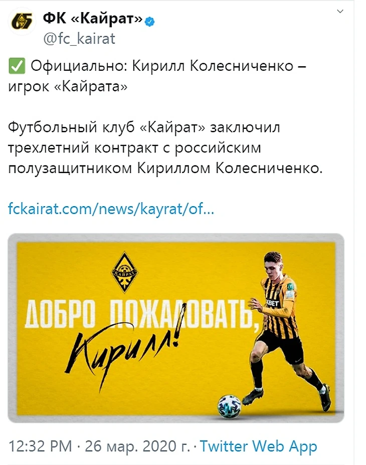 Алматинский "Кайрат" подписал контракт с российским полузащитником Кириллом Колесниченко.