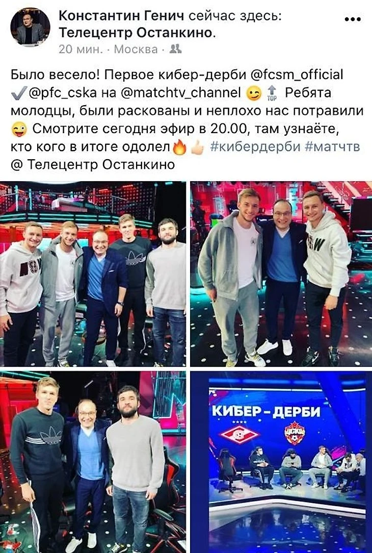 Эфир киберспортивного матча пройдет на Матч ТВ сегодня вечером, начало в 20:00. При этом, сама игра уже состоялась, как сообщает комментатор Константин Генич на своей странице в Facebook. Итог встречи не уточняется. "Было весело! Первое кибер-дерби "Спартак" - ЦСКА на Матч ТВ. Ребята молодцы, были раскованы и неплохо нас потравили. Смотрите эфир в 20:00, там узнаете кто кого в итоге одолел", - написал Генич. Напомним, что "Спартак" представляли Георгий Джикия и Александр Соболев, а ЦСКА - Константин Кучаев и Федор Чалов.