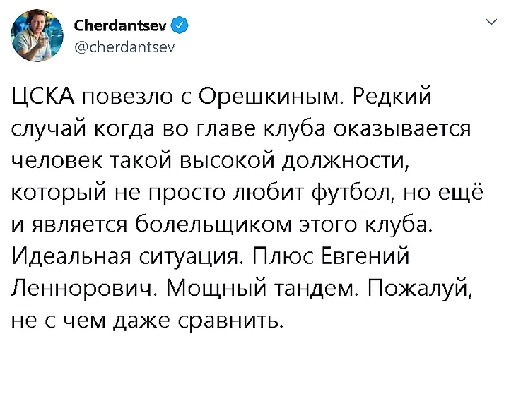 Спортивный комментатор Георгий Черданцев прокомментировал новость о том, что председателем совета директоров ЦСКА стал помощник президента России, член наблюдательного совета ВЭБ.РФ Максим Орешкин.