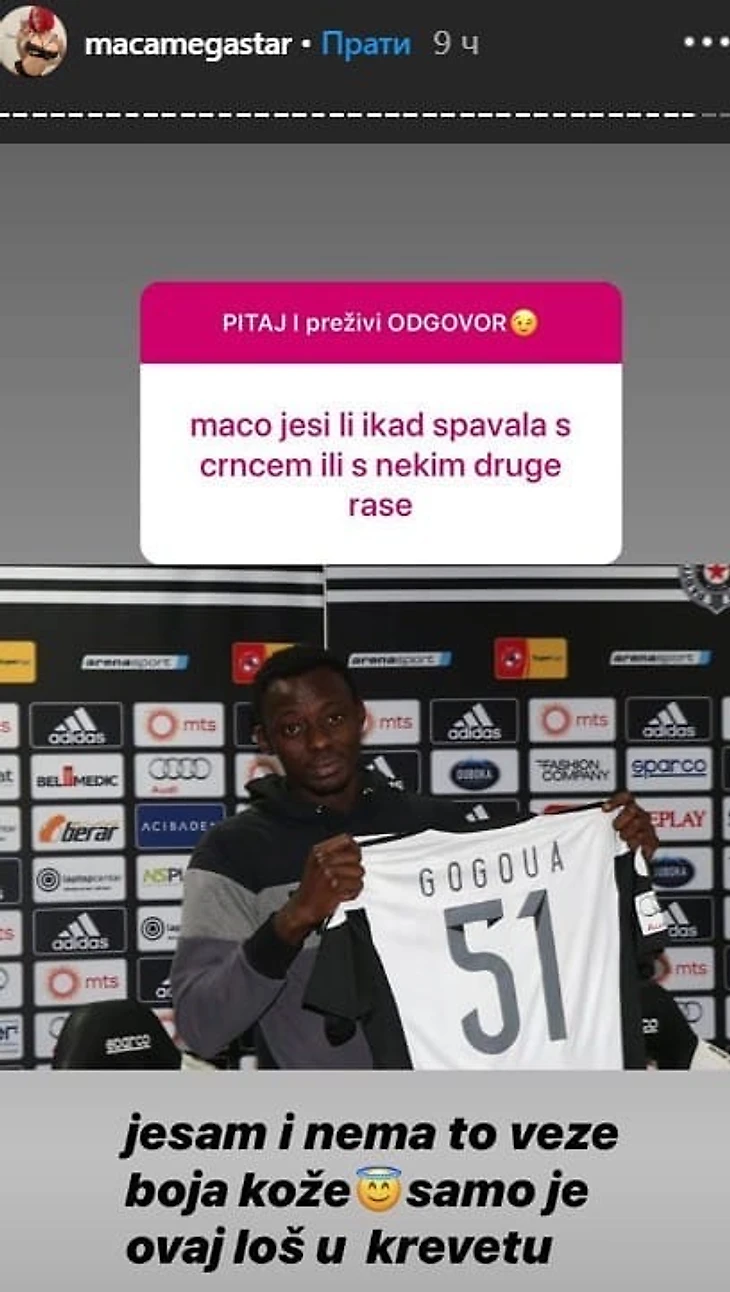 Телеведущая Сенада Нуркич рассказала, что у неё были отношения с ивуарийским защитником московского ЦСКА Седриком Гогуа. Об этом она сообщила, отвечая на вопрос, был ли у неё секс с темнокожим мужчиной.