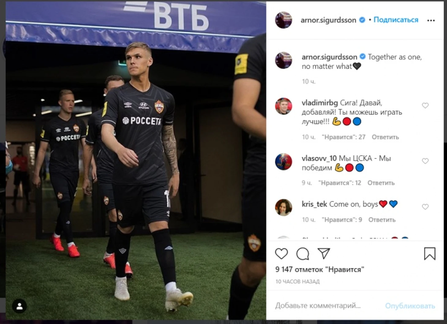 21-летний исландский полузащитник московского ЦСКА Арнор Сигурдссон сделал новую публикацию в «Инстаграме», прикрепив фото с матча 24-го тура Российской Премьер-Лиги с «Динамо», завершившегося вничью – 0:0.