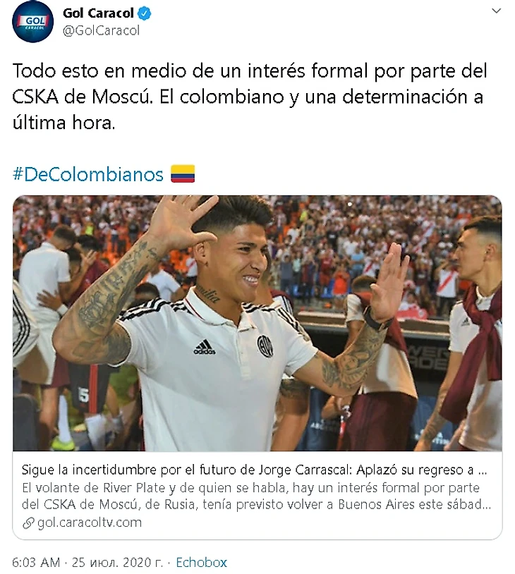 Полузащитник «Ривер Плейта» Хорхе Карраскаль может продолжить карьеру в чемпионате России, утверждает GolCaracol в Twitter.