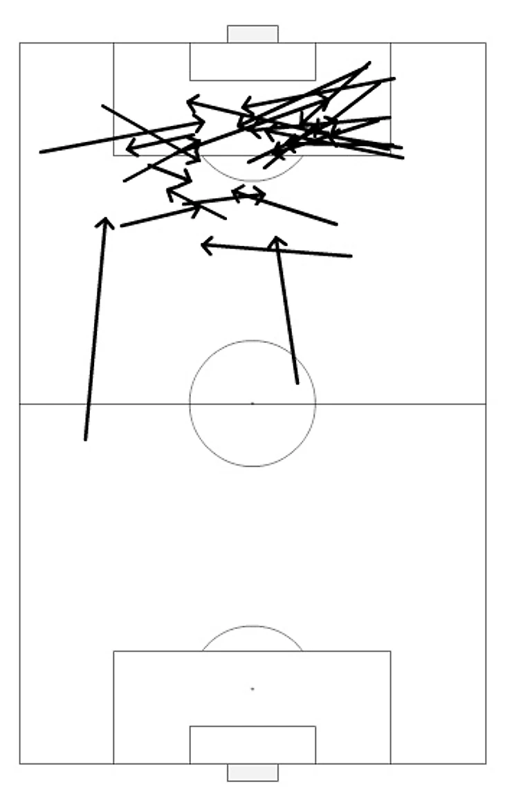 Интересно, что обыгрыш флангового защитника перед штрафной Сигурдссон не использует вообще – в изоляциях он всегда лезет в центр с мячом, либо отдает передачу, даже если она откатывает атаку. При том, что у исландца 4.3 касания в штрафной за матч и немало быстрых атак, когда он атакует штрафную с края, Сигурдссон не использует очень много моментов из-за нежелания идти в обводку. Только сумбурный гол Ахмату с предварительным рикошетом, где он убрал защитника на углу штрафной и забил в дальний, можно назвать подготовкой удара через обводку – больше таких эпизодов у Сигурдссона не было.