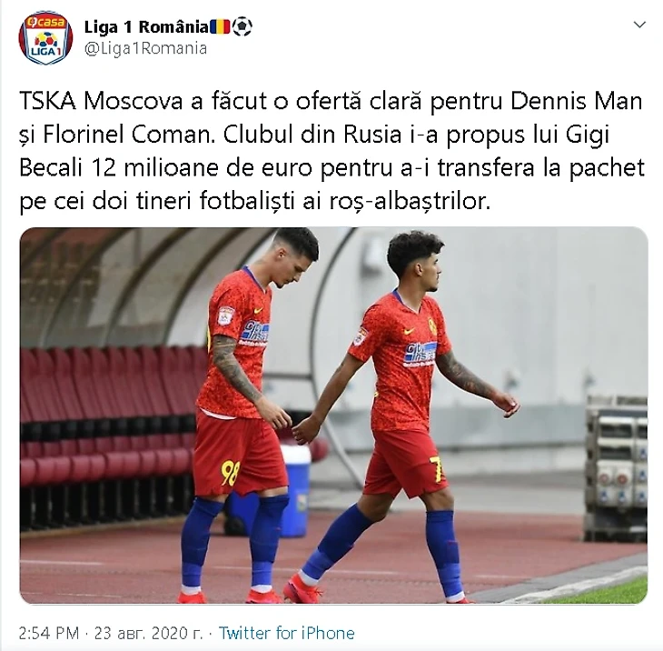 ЦСКА сделал предложение «Стяуа» по покупке двух молодых румыновДенниса Мана и Флоринела Комана.Российский клуб предложил 12 миллионов евро на покупку молодых футболистов для перехода в ЦСКА.