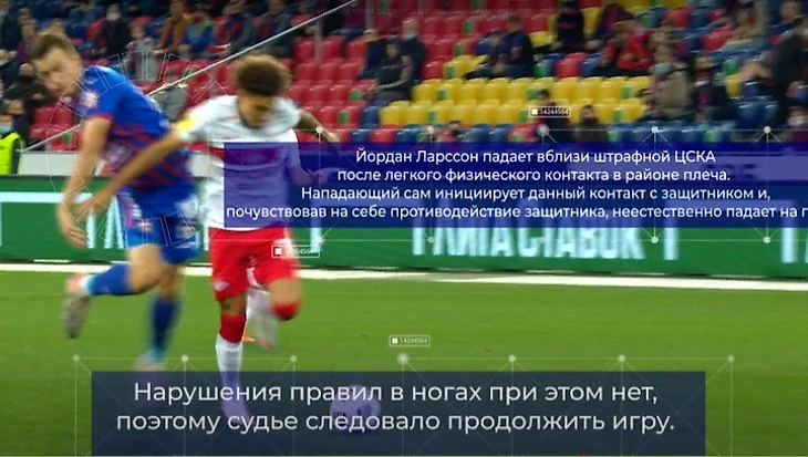 Решение ЭСК РФС мотивировано тем, что футболист «Спартака» Йордан Ларсон падает вблизи штрафной площади ПФК ЦСКА после легкого физического контакта в районе плеча. По мнению членов Комиссии, нападающий сам инициирует данный контакт с защитником и, почувствовав на себе противодействие защитника, неестественно падает на газон после него. Нарушения правил в ногах при этом нет, поэтому судье следовало продолжить игру. Это соответствовало бы требованиям Департамента судейства, критериально оценивающим данный тип единоборств как выполненные в рамках Правил игры.