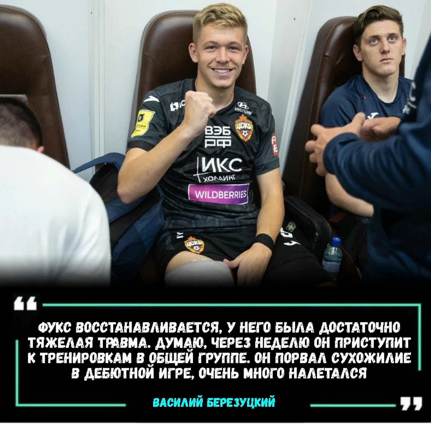 — Фукс восстанавливается, у него была достаточно тяжелая травма. Думаю, через неделю он приступит к тренировкам в общей группе. Он порвал сухожилие в дебютной игре, очень много налетался, — рассказал Березуцкий в youtube-программе "Коммент.Шоу".