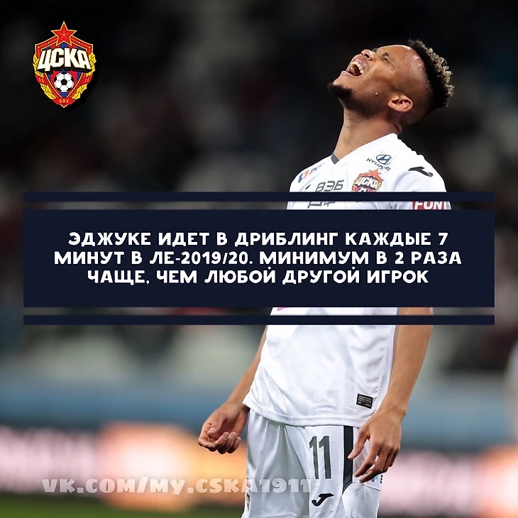 Полузащитник ЦСКА Чидера Эджуке идёт в дриблинг каждые семь минут в текущем сезоне Лиги Европы, сообщает Opta Sport.