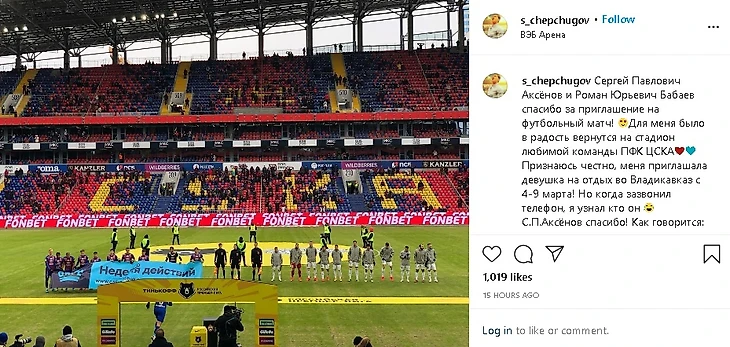 "Сергей Павлович Аксёнов и Роман Юрьевич Бабаев спасибо за приглашение на футбольный матч! Для меня было в радость вернутся на стадион любимой команды ПФК ЦСКА. Признаюсь честно, меня приглашала девушка на отдых во Владикавказ с 4-9 марта! Но когда зазвонил телефон, я узнал кто он. С.П.Аксёнов спасибо! Как говорится: Ну, а девушки? А Девушки - потом! Сегодня замечательный день! С победой! Большой привет болельщикам!" - написал Чупчугов на своей странице в Instagram (орфография и пунктуация автора).