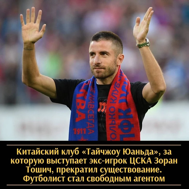 Решение о закрытии клуба, выступающего во второй лиге Китая, было принято в связи с финансовыми проблемами. Таким образом, бывший полузащитник ЦСКА Зоран Тошич, игравший в составе «Тайчжоу Юаньда», стал свободным агентом. Напомним, Тошич стал игроком «Тайчжоу Юаньда» в феврале 2020 года, принял участие в 10 матчах за клуб во всех турнирах и забил 3 гола. Сербский полузащитник защищал цвета московского ЦСКА с 2010 по 2017 год. За это время он завоевал с «армейцами» три титула чемпиона России, а также два Кубка и Суперкубка страны. В составе московского клуба серб в 241 матче забил 47 мячей.