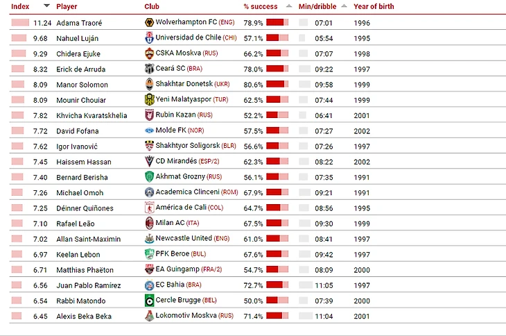 Возглавил список лучших дриблеров нападающий «Вулверхэмптона» Адама Траоре. Его индекс — 11,24 при 78,9% успешных обводок. Следом за ним расположился полузащитник «Универсидад де Чили» Науэль Лухан (9,68 и 57,1%). Замкнул тройку форвард ЦСКА Чидера Эджуке (9,29 и 66,2%).