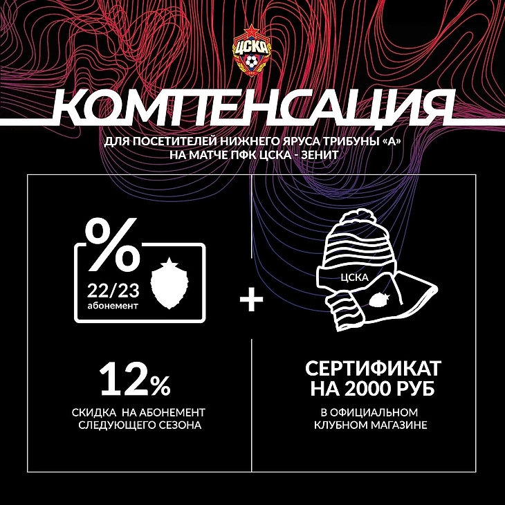 Для посетителей секторов 203-206 трибуны «А» на матче ПФК ЦСКА — «Зенит» предусмотрен сертификат на 2000 рублей в официальный магазин ПФК ЦСКА и скидка 12% на абонемент следующего сезона. Владельцы абонементов, не попавшие на матч ПФК ЦСКА — «Арсенал» смогут вернуть деньги, эквивалентные стоимости посещения этой игры, либо получат скидку 7% на абонемент следующего сезона, что превышает стоимость посещения сегодняшнего матча. Детальная информация по получению компенсации будет представлена в ближайшее время. Следите за публикациями в соцсетях и имейл-рассылками от клуба.