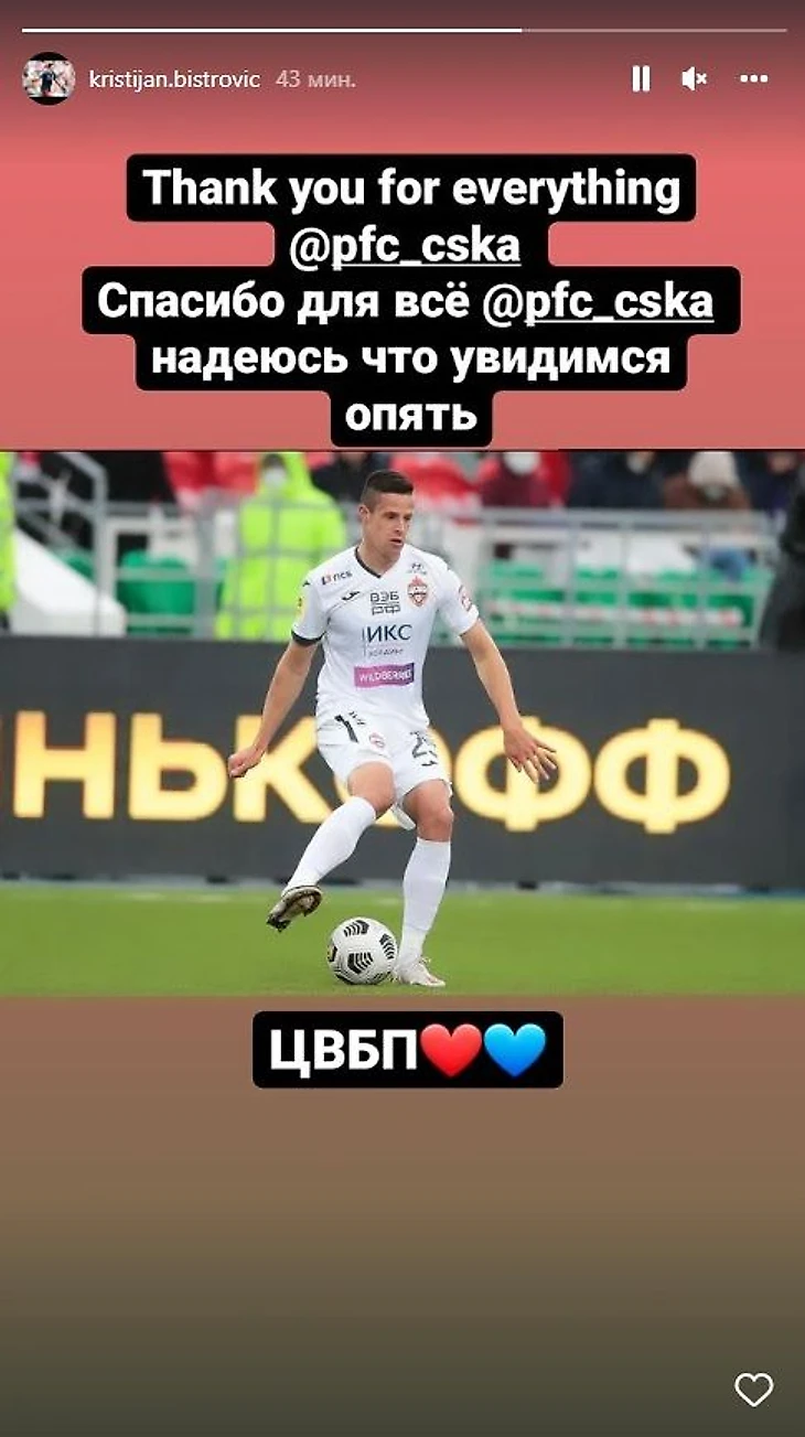 Перешедший в «Лечче» полузащитник Кристиян Бистрович попрощался с ЦСКА, поблагодарив московский клуб.