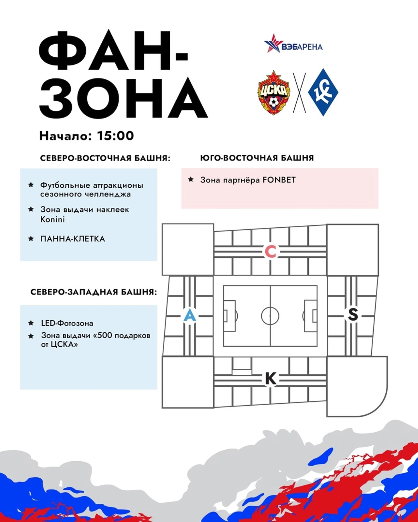 Перед игрой вас будут ждать аттракционы сезонного челленджа («Силомер», «Точный гол» и «Попади в бочку»), специальная развлекательная зона от FONBET, тематическая фотозона и другое