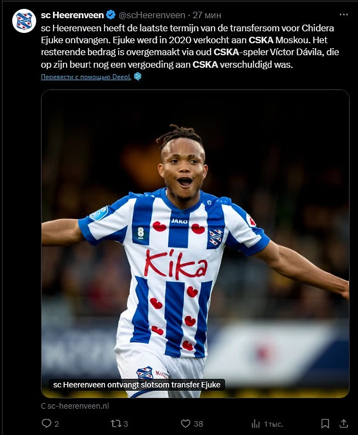 «Херенвен» получил последнюю часть выплат от ЦСКА по трансферу за Чидера Эджуке.