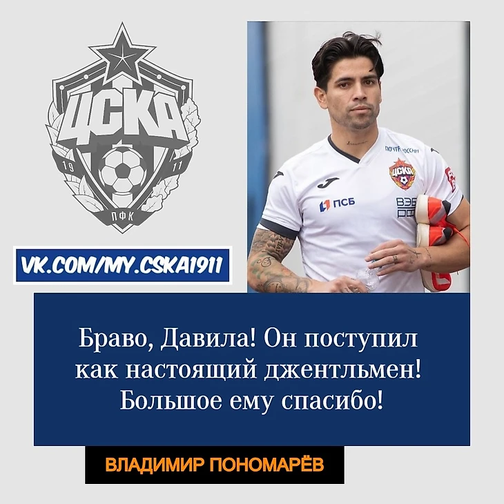 «Браво, Давила! Он поступил как настоящий джентльмен! Молодец! Стоит признать, что в нынешнее время он бы мог вообще не возвращать деньги и назвать нашу страну и ЦСКА самыми плохими словами. Есть ведь примеры, когда парни, которые тут были в шоколаде, потом резко меняли свое мнение и поливали нас грязью. А Давила просто молодец, большое ему спасибо. Теперь будем надеяться, что ЦСКА купит новых футболистов. Как я уже говорил, нужны быстрые нападающие», — сказал Пономарев.