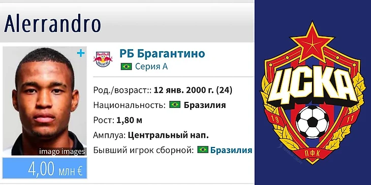 Алеррандро переходит в ЦСКА за 5 млн евро: форвард выкупит сам себя у «РБ Брагантино» и формально перейдёт в ЦСКА на правах свободного агента – контракт до 2029 года. Алеррандро – второй лучший бомбардир чемпионата Бразилии-2024: в прошлом году форвард набрал «15+4» в 34 матчах, выступая на правах аренды за «Виторию» — журналист Вене Касагранде